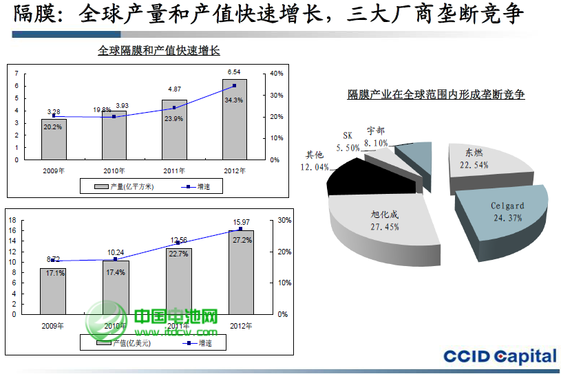 數據顯示,高端電池隔膜技術仍掌握在日美韓等極少數國家企業手里,日本東燃化學、旭化成、宇部、韓國SK和美國Celgard五家企業占據了全球市場份額的87%。2012年全球鋰電池隔膜產量達到6.54億平方米,比2011年增長34.3%;2102年全球鋰電池隔膜產值達到15.97億美元,比2011年增長27.2%。