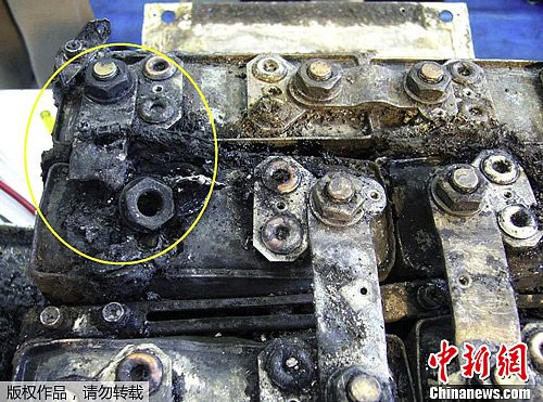 當地時間2月5日,日本運輸安全委員會公布了1月16日緊急迫降的波音787飛機電池照片。圖中畫圓部分是發生事故部位。