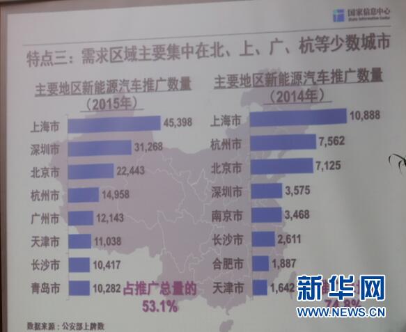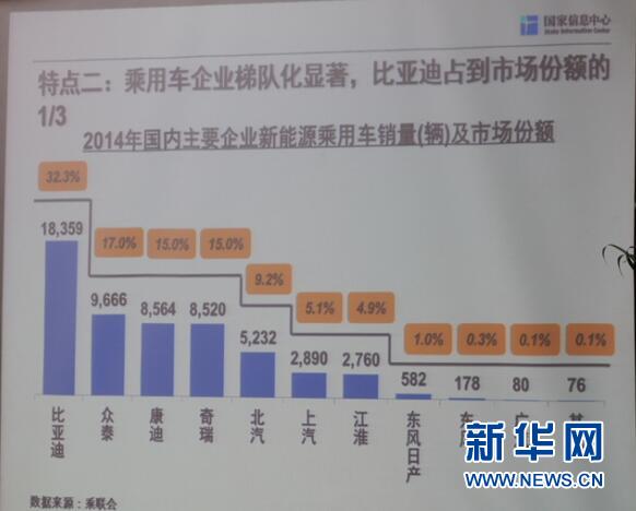 據國家信息中心信息資源開發部徐長明主任介紹,近期中國新能源汽車市場呈現三個發展特點:其一,2014年以來爆發式增長明顯,且純電動與插電混動同步發展;其二,乘用車企業梯隊化顯著,比亞迪占到市場份額三分之一;其三,需求區域主要集中在北上廣杭等少數城市。