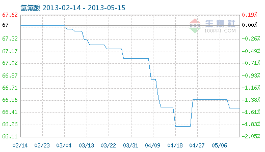 5月14日氫氟酸商品指數(shù)為66.47,與昨日持平,較周期內最高點100.00點(2011-09-01)下降了33.53%,較2012年10月23日最低點62.16點上漲了6.93%。