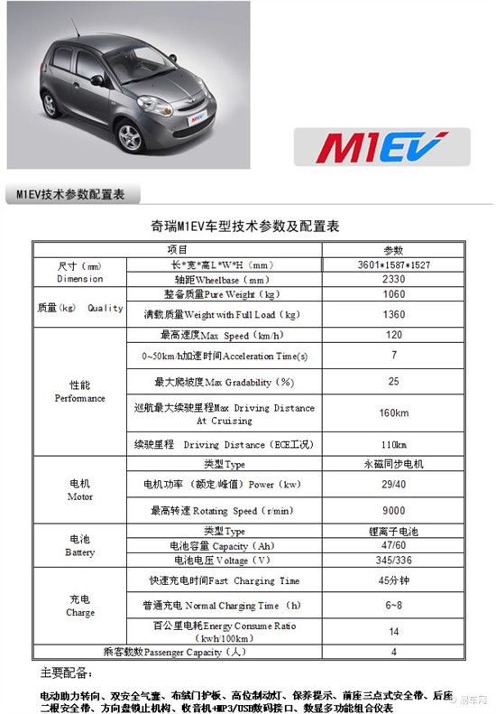 奇瑞M1EV純電動汽車在奇瑞M1平臺的基礎上開發(fā)的一款純電動車,整車造型完美、線條流暢、小巧玲瓏、做工精細。該車配備了高效率的永磁同步電機,高性能的磷酸鐵鋰電池;安全方面配備了安全氣囊,標配ABS防抱死系統(tǒng)等配置,保證了駕駛的安全性和舒適性;配備了EPS,電動制冷空調(diào)和制熱空調(diào),無級變速器等智能駕控系統(tǒng)。純電動驅(qū)動系統(tǒng)體現(xiàn)了最新的科技成果,真正實現(xiàn)了零排放、零污染、純電動行駛。其主要技術特點如下: