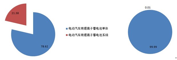 圖2 2013年1-4月我國出口(左)和進口(右)鋰電池產品構成情況