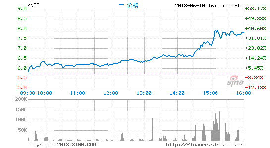 6月5日,康迪車業(yè)稱,由該公司與吉利汽車[微博]控股有限公司聯(lián)合研發(fā)的純電動(dòng)轎車JL7001BEV獲得中國工信部批準(zhǔn)。受此利好消息刺激,康迪車業(yè)(KNDI)股票放天量暴漲36%。