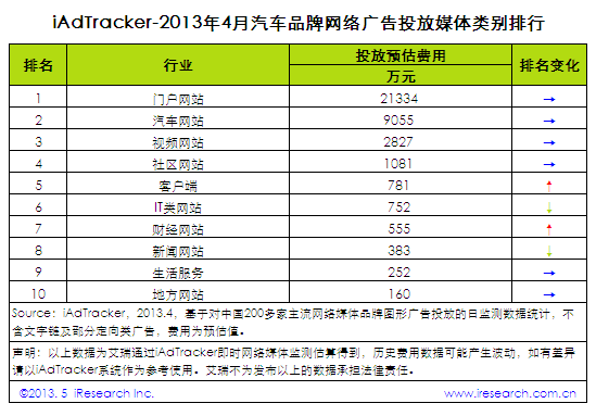最新數(shù)據(jù)顯示,2013年4月,門戶網(wǎng)站和汽車網(wǎng)站仍是汽車品牌網(wǎng)絡(luò)廣告投放的首選平臺。其中,門戶網(wǎng)站投放費用達(dá)2.1 億元,占總投放費用的56.9%;汽車網(wǎng)站投放費用達(dá)9055萬元,占總投放費用的24.2%,兩者合計占總投放費用的81.1%。