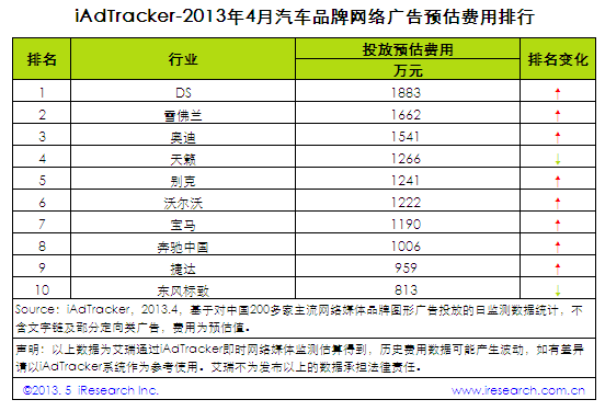 2013年4月,汽車品牌網(wǎng)絡(luò)廣告總投放費用達(dá)3.7億元。其中,DS投放費用達(dá)1883萬元,位居第一;雪佛蘭投放費用達(dá)1662萬元,位居第二;奧迪投放費用達(dá)1541萬元,位居第三。