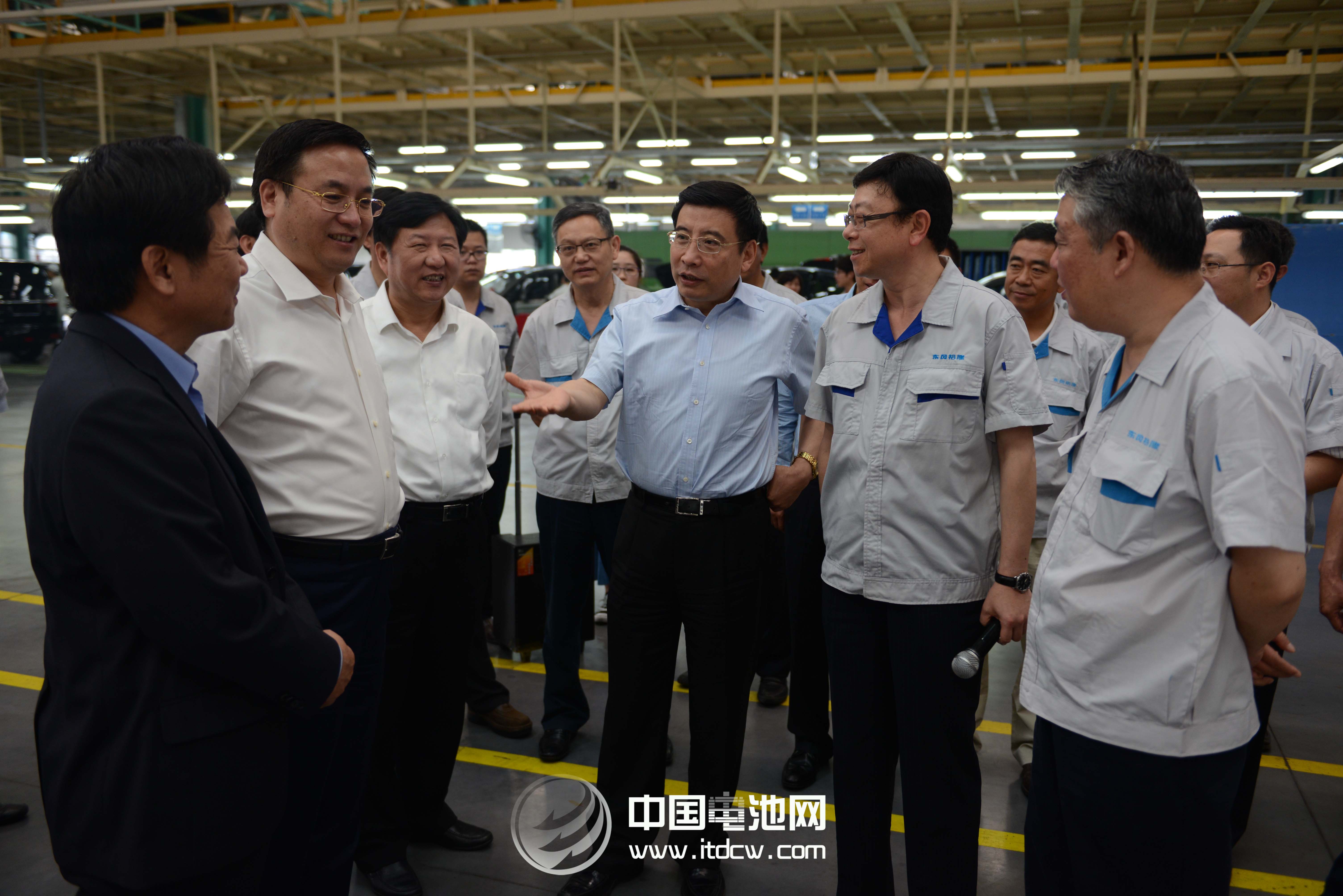 圖為苗圩(中)在浙江省副省長毛光烈(左三)、東風汽車公司總經理朱福壽(左二)等陪同下,在納智捷汽車生產現場調研