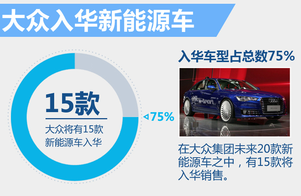 根據大眾集團在新能源領域的規劃,到2020年,大眾集團將陸續推出20款新能源汽車,其中面向中國市場的數量將達到15款,照此看來,未來中國市場銷售的大眾新能源車將占總數的75%。首款實現在華國產的A6L e-tron將在年內上市,專為純電動車打造的MEB平臺也將在之后引入國內,推進大眾純電動車的本地化生產進程。
