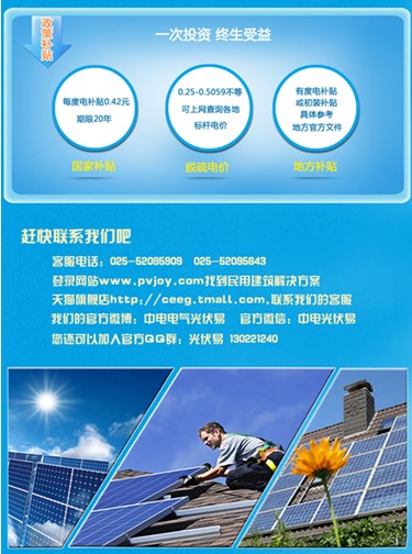 為響應國家發展分布式光伏的號召,推行“倡導綠色生活,爭做節能先鋒”的生活理念,同時考慮家庭安裝光伏系統屋頂產權明晰便于申報的實際,中電光伏易正式推出“別墅屋頂光伏電站雙百計劃”,將陸續在全國100個城市尋找100個吃屋頂光伏電站螃蟹的別墅業主,以優質的產品、一流的服務、優惠的價格為業主設計安裝性價比最高的家庭光伏電站。