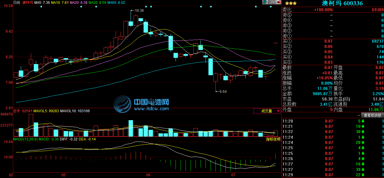 今日澳柯瑪開(kāi)盤(pán)再度一字漲停,這已經(jīng)是第二個(gè)一字漲停,股價(jià)報(bào)8.87元。