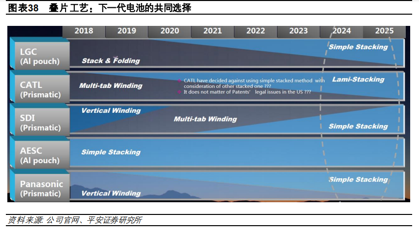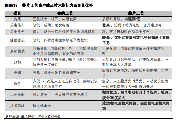 第二是與傳統(tǒng)卷繞工藝不同,在制造工藝上公司采用了疊片制造工藝,長而薄的刀片結(jié)構(gòu)電芯散熱 性明顯提高,而且本身可以作為結(jié)構(gòu)件,疊加無模組技術(shù),可以使安全性更好、成本更低、體積能 量更高,預(yù)計(jì)將是未來動(dòng)力電池的主流發(fā)展方向。