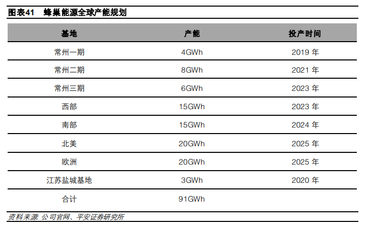 至 2025 年蜂巢國內(nèi)產(chǎn)能總規(guī)劃為 51GWh,建成產(chǎn)能 4Gwh,全球產(chǎn)能規(guī)劃約 91GWh,其中歐洲規(guī)劃 20GWH,北美規(guī)劃 20GWH。