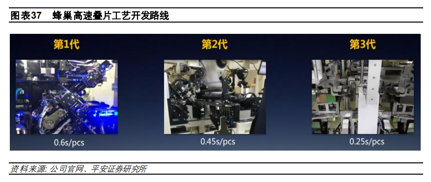 預(yù)計(jì)追平卷繞工藝生產(chǎn)效率的 0.25 s/pcs 的第三代疊片工藝將于 2023 年完成開發(fā),在制造設(shè)備上,公司采購的是韓國的鋰電設(shè)備,第二代設(shè)備公司參與共同研發(fā),并且簽訂了排他協(xié)議,該設(shè)備 于 2020 年中即可投產(chǎn),效率將會(huì)提升至 0.45s/pcs 的水平,相比第一代生產(chǎn)效率提升25%。