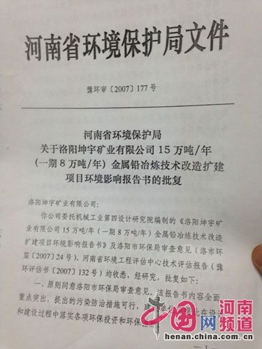 永寧金鉛安環部羅宗民部長介紹,在公司試生產延期結束后,省環保廳給企業提出整改性意見,要求企業進行“后環評”(環境影響回顧性評價)整改,現在該公司已經按照省環保廳的意見整改完畢,并在2013年6月24日得到了洛寧縣環保局對洛陽永寧金鉛冶煉有限公司15萬噸/年(一期8萬噸/年)金屬鉛冶煉技術改造擴建項目環境影響回顧性評價的初審意見,現正在逐級向市、省環保部門申請審批。整改期間環保部門沒有給企業辦理驗收手續,也未給企業下達停止生產的通知,在某種程度上環保部門也默許了企業生產。