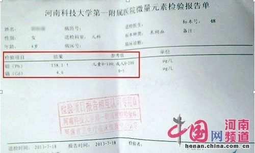 據媒體此前報道,今年7月中旬,西山底鄉南洞村數名兒童出現血鉛中毒,其中一名4歲女童小婕出現多動、厭食等癥狀,經河南科技大學第一附屬醫院化驗檢查,結果顯示其血液中鉛含量達158.1ug/L(毫克/升)屬鉛中毒。