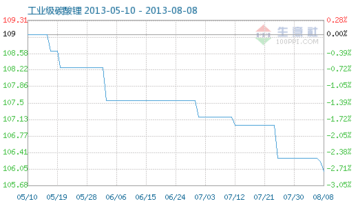 8月8日工業級碳酸鋰商品指數為105.99,較昨日下降了0.22點,較周期內最高點112.10點(2012-11-04)下降了5.45%,較2012年01月05日最低。