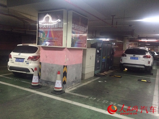 除了租車公司大面積占用公共充電點,一些汽油車以及不充電的新能源車占用充電車位的現象也很常見。在中關村鼎好電子商城地下車庫,共有6個充電車位,其中2個故障,一個車位被汽油車占了,2個車位被不充電的新能源車占了,兩位車主只能將車停在過道上,將充電線拉出來充電。
