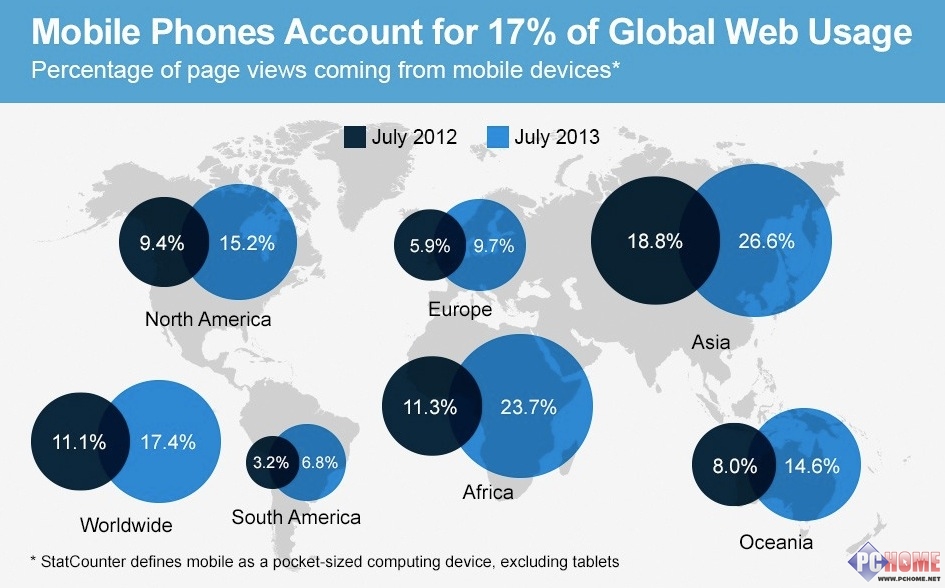 由于移動(dòng)智能設(shè)備的高速發(fā)展,人們上網(wǎng)的方式也隨之得到改變。過(guò)去我們通過(guò)傳統(tǒng)的桌面電腦上網(wǎng)沖浪,而如今每個(gè)人都可以通過(guò)自己手上的手機(jī)漫游全球網(wǎng)絡(luò)。根據(jù)StatCounter發(fā)布的最新報(bào)告顯示,截至至2013年7月,全球互聯(lián)網(wǎng)17.4%的網(wǎng)絡(luò)流量來(lái)自于移動(dòng)智能終端,這一數(shù)字與去年同期相比增長(zhǎng)了6%。