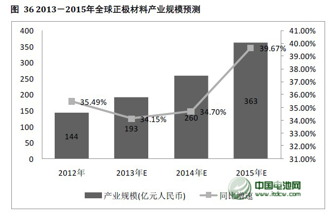 就中國產(chǎn)業(yè)而言,得益于動力鋰離子電池的快速發(fā)展,2013年正極材料產(chǎn)業(yè)整體產(chǎn)業(yè)規(guī)模將達(dá)到94億元,同比增長33.2%,并且未來三年市場規(guī)模增速均會保持在30%以上,到2015年整個(gè)中國正極材料產(chǎn)業(yè)的市場規(guī)模將達(dá)到159億元。