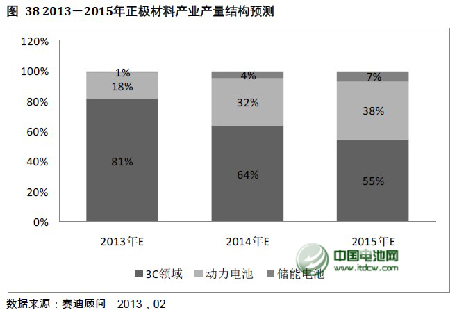 從鋰離子電池市場結(jié)構(gòu)來看,中國電池網(wǎng)戰(zhàn)略合作機(jī)構(gòu)——賽迪顧問認(rèn)為,正極材料規(guī)模未來三年內(nèi)增長的動力來自于以新能源汽車電池為代表的動力電池。到2015年鋰離子動力電池市場規(guī)模占比將達(dá)到38%。