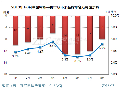 (圖) 2013年1-8月中國智能手機市場小米品牌排名及關注走勢