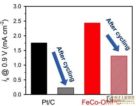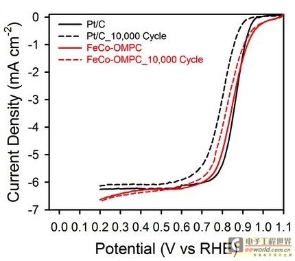 圖2:鉑/碳催化劑和FeCo-OMPC催化劑在一萬次工作前后的產(chǎn)生電流的對比