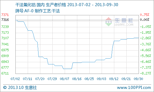 價(jià)格走勢(shì) 據(jù)生意社大宗榜數(shù)據(jù)顯示,9月干法氟化鋁市場(chǎng)價(jià)格上漲,截至月末國(guó)內(nèi)出廠價(jià)格在7116元/噸,較月初價(jià)格6866元/噸上漲3.64%。,當(dāng)前價(jià)格同比去年下降了5.95%,市場(chǎng)主流報(bào)價(jià)為7000-7200元