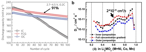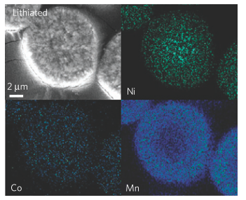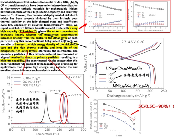 在這種梯度材料中,元素的含量由顆粒中心到外層呈現一種連續的梯度分布,保證了成分的均質。在這篇集合了五行三才之力的杰作中,Sun Yang-Kook發現了一種核心部分的富鎳組成逐步過渡到外殼的富錳組成這么一種復合材料。