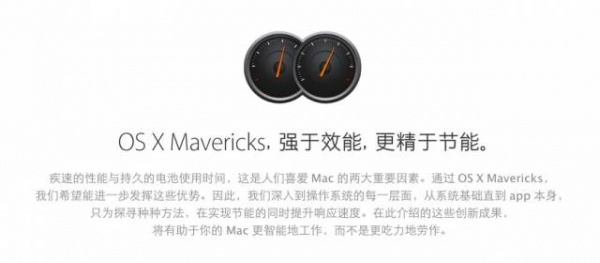 2013年的新款Mac電腦主打功能就是低能耗,這是由于新款Mac搭載了英特爾Haswell處理器。今年6月發(fā)布的新款MacBook Air使用了可以使用一整天的電池,即將發(fā)布的MacBook Pro也會使用相似的配置。此外,在即將發(fā)布的OS X Mavericks系統(tǒng)中,能耗和續(xù)航問題也是重點之一。蘋果稱Mavericks是最強大的OS X,也是最省電的操作系統(tǒng)。