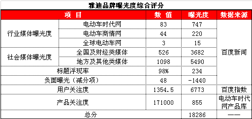 雅迪綜合評分僅與第一名相差19分,這對于數(shù)值過萬的總評分來說幾乎可以忽略。雅迪取得如此令人矚目的成績,與其獨特的創(chuàng)新營銷方式密不可分。從下表中可以看出,雅迪第三季度網(wǎng)絡營銷中成績斐然,標題浮現(xiàn)率高達98%,媒體報道量超過1280篇,并且其產(chǎn)品亦受到了經(jīng)銷商及消費市場的廣泛關注,并實現(xiàn)了17.1萬人次的瀏覽記錄。