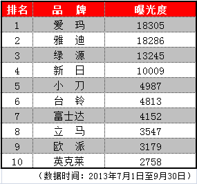 此次統(tǒng)計的數(shù)據(jù)是對各品牌整個第三季度的媒體曝光度、用戶關注度和產(chǎn)品關注度三個方面進行的綜合考評,動態(tài)評估了各品牌在行業(yè)內的口碑及各自影響力的變化。