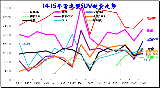 緊湊型SUV 市場呈現(xiàn)群雄紛戰(zhàn)的復雜局面,8月的自主仍是較強,哈佛H6的年初強勢增長,但節(jié)后回落不大,8月稍有調整,但仍是領軍車型。本月的寶駿560推出就迅速進入三強的位置。而長安的CS35和CS75也是很強的,CS75分流了部分H6的市場,形成此消彼長的特征。主力車型的途觀和翼虎等零售表現(xiàn)較強,但同比表現(xiàn)已經偏弱。昂科威等SUV迅速走強,體現(xiàn)了美系的SUV優(yōu)勢逐步建立。奇瑞的SUV表現(xiàn)超強,瑞虎成為SUV的自主主力系列,瑞虎和瑞虎5表現(xiàn)很好。長城、長安奇瑞的自主三強逐步穩(wěn)固,隨后的比亞迪和眾泰的A級SUV表現(xiàn)也是較強的,尤其是唐的表現(xiàn)還是很不錯的。傳祺GS4的表現(xiàn)也是極其突出。