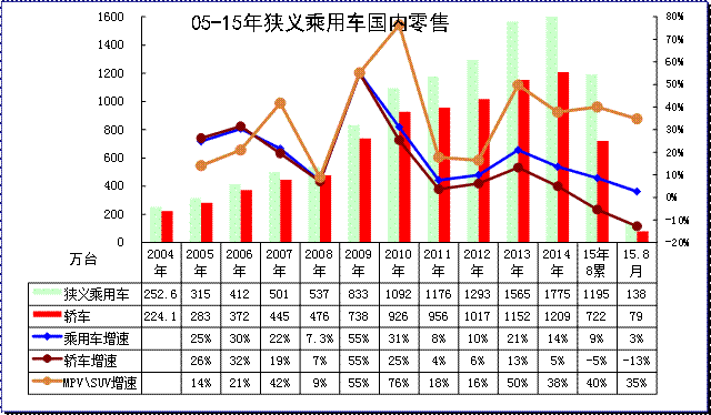 根據(jù)全國乘聯(lián)會數(shù)據(jù),2014年累計國內(nèi)狹義乘用車綜合零售銷量1775萬臺,增速為14%。15年車市零售開局走強有春節(jié)支撐,1-8月零售1195萬臺,同比增9%。8月的中國狹義乘用車綜合零售銷量138萬臺,增速為3%。15年8月的狹義乘用車仍是多功能車高增長,轎車低迷。