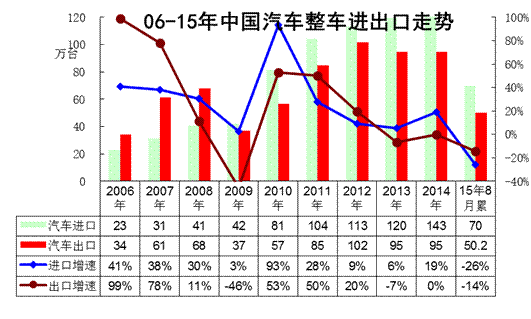根據(jù)全國海關(guān)統(tǒng)計,2015年1-7月的中國汽車累計進口63萬臺,累計增速-24%。總體看今年的進出口累計增速走勢均有下滑,進口增速下滑到-24%,出口下降到-11%。今年進口車的波動遠大于出口市場,今年的進口受傷就很嚴重。但出口的壓力也在急劇增大。