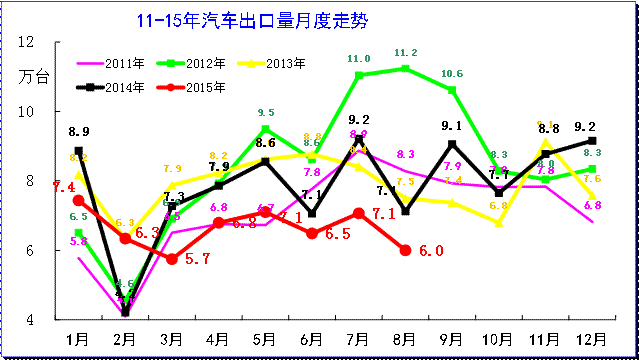 從月度走勢看,前兩年的出口仍呈現(xiàn)季節(jié)性特征,呈現(xiàn)夏季走高過山車的見頂回落走勢特征,但15年車市出口開局就出現(xiàn)高位下滑的局面。14年尚有走強向上的趨勢。15年的上半年出口量低迷。15年5月的汽車出口達到7.1萬的,隨后沒有出現(xiàn)夏季的攀升特征,8月仍處于7.1萬的歷史低位,風(fēng)險巨大。