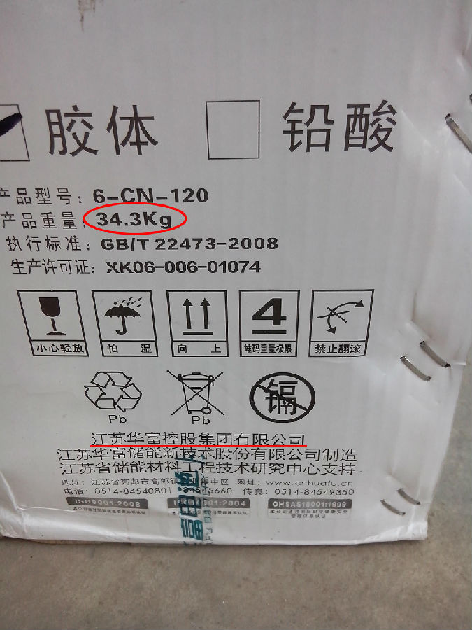 就從本次項(xiàng)目中,價(jià)值最高最讓人質(zhì)疑的全膠體蓄電池產(chǎn)品說(shuō)起,通過(guò)中國(guó)電池工業(yè)協(xié)會(huì)給出的識(shí)別全膠體和亞膠體的方法,我們通過(guò)重量和外形尺寸判斷,發(fā)現(xiàn)江蘇華富儲(chǔ)能新技術(shù)股份有限公司生產(chǎn)的膠體電池外形、重量不滿足要求,為不合格膠體電池,以下為在施工現(xiàn)場(chǎng)取得的圖片。