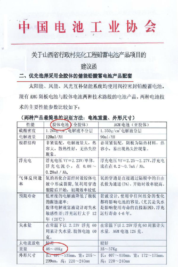 2013年7月8日,中國(guó)電池工業(yè)協(xié)會(huì)《關(guān)于山西省行政村亮化工程鉛蓄電池產(chǎn)品項(xiàng)目的建議函》中第二條,明確給出了膠體電池(全膠體)與AGM電池(亞膠體)的識(shí)別方法。