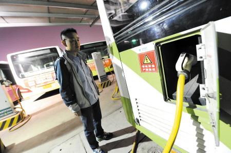 昨晚10時,在長沙汽車東站電動汽車充電站,電動公交車在此“補充能量”。石禎專 攝