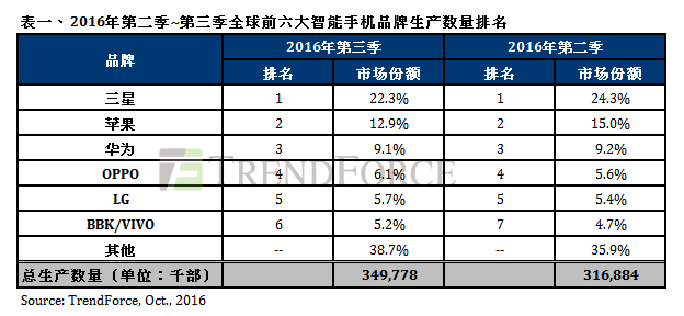 第三季華為智能手機生產數量達3200萬部,季成長約10.3%,穩坐全球第三。雖然雙鏡頭旗艦機種P9在其他中國智能手機品牌夾擊下銷售不如預期,但在旺季需求帶動下,華為整體生產數量仍持續在第三季攀高。