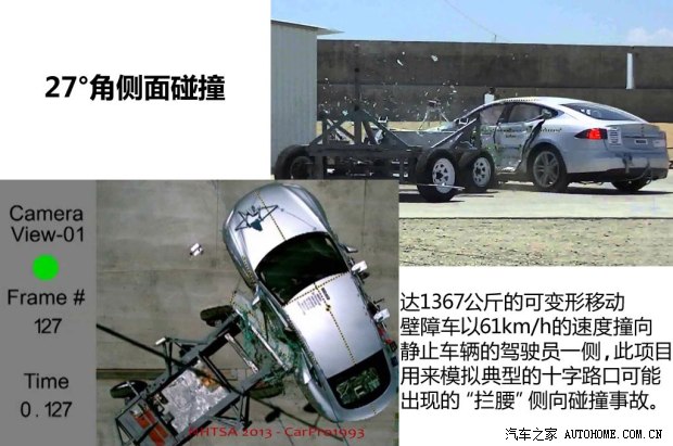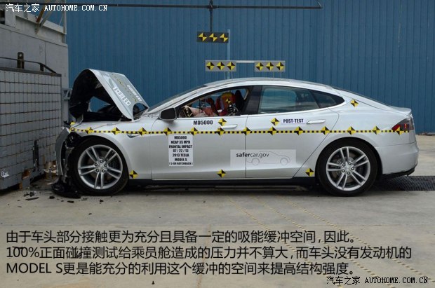 之前TESLA MODEL S在NHTSA(美國高速公路安全協會)進行了碰撞測試,最終拿到了五星的成績,這個結果讓埃隆?馬斯克有點自我膨脹,不管怎樣,MODEL S在各項碰撞測試中對假人的保護以及電池的狀態還是值得稱道的。下面我們通過當時碰撞的情況來看看這款車在被動安全方面表現如何。