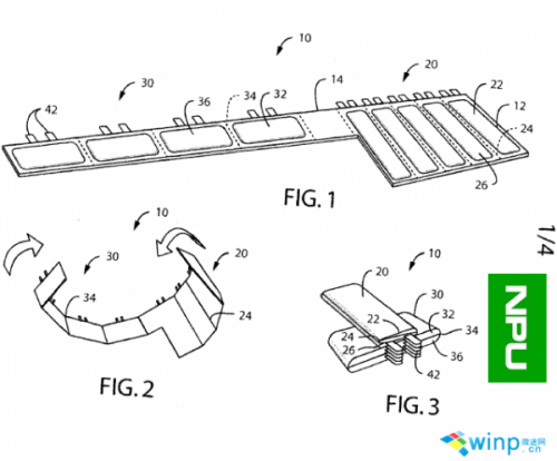 在專利圖上,我們可以看到,電池被分割成很多個小節(jié),并且通過類似手表腕帶的形式進行聯(lián)結(jié),多個可折疊的小電池通過層疊的方式可以構(gòu)成一塊標準大小的電池。這樣的設(shè)計可以充分利用有限度的空間來開發(fā)便攜式電子設(shè)備,這款設(shè)備的外觀可能類似于手表。
