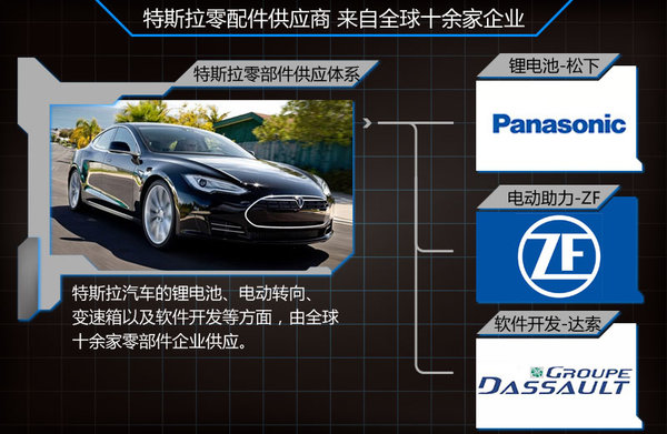 特斯拉旗下的在售車型Model S,采用全球零部件供應商的采購模式,通過企業所指定的標準,讓合作供應商按照要求進行生產,從而通過高性價比的方式完成組裝。其中鋰電池、電動轉向、變速箱以及軟件開發等方面,便是由全球十余家零部件企業供應,包括松下、ZF、博格華納、達索系統等。此次,特斯拉汽車將與國內零部件企業溝通相關事宜,長信科技有望成為中國首個為特斯拉提供核心零部件的供應商。