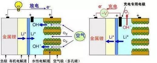 鋰空氣電池的基本化學原理十分簡單。放電時,從負極出發的鋰離子在正極與空氣中的氧氣反應,產生一種叫過氧化鋰的固體產物,填充于碳電極的孔隙中。充電時,化學過程逆轉,過氧化鋰被分解釋放氧氣。