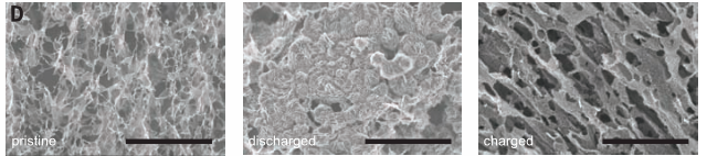 劍橋大學的研究人員改用多層次的大孔石墨烯作為正極材料,利用水和碘化鋰作為電解液添加劑,最終產生和分解的是氫氧化鋰,而不是此前電池中的過氧化鋰。氫氧化鋰比過氧化鋰要穩定,大大降低了電池中的副反應,提高了電池性能。其中碘化鋰除了幫助分解氫氧化鋰外,似乎還起到了保護鋰金屬負極的作用,使電池對于過量的水有一定的免疫性。沒有它,同量的水會直接使電池失效,完全無法充放電。由于石墨烯氧化物具有多孔性,研究人員估計這種電池可循環超過2000次。