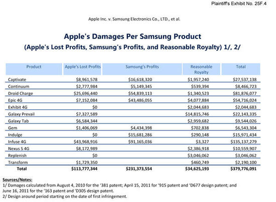 在提交給陪審團的三星侵權(quán)產(chǎn)品圖表中,蘋果著重指出了兩款銷售額最高的手機設(shè)備,包括Infuse4G(累計銷售額1.35億美元)和Droid Charge(8100萬美元),這兩款手機目前已經(jīng)在美國地區(qū)下市。