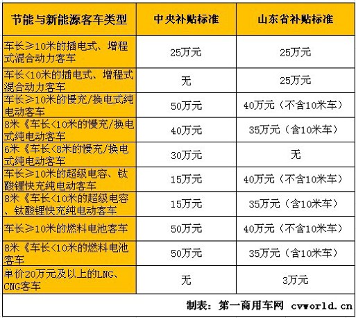 山東省與中央對新能源城市客車的補貼政策對比