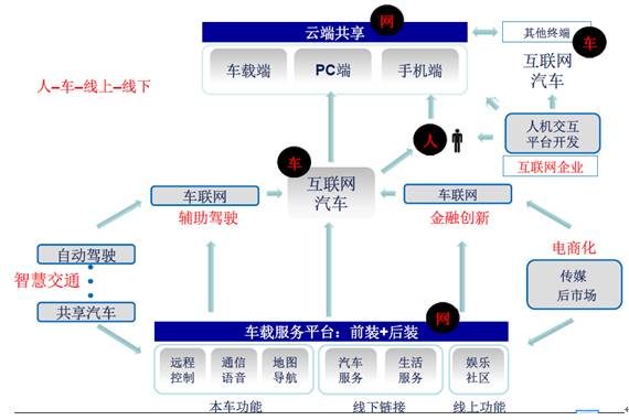 這張圖就是以后投資照這張圖來就可以了(見PPT),相關的智能化主要在這幾個領域,車聯網有輔助駕駛,對應指揮交通的一些公司、IT公司,還有汽車的消費,就是電商化,金融創新的像車聯網、UPI各方面,基本上車聯網是按這張圖來,車跟車互聯、車跟車庫的互聯。