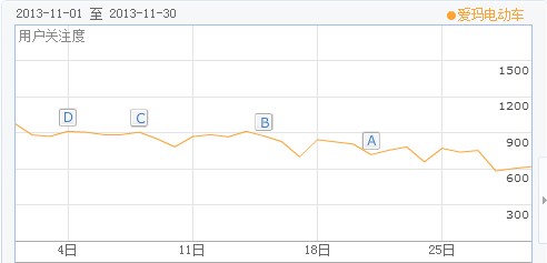 從表中數據可以看出,11月份愛瑪在各個項目中表現出色。首先是媒體曝光度,10月底簽約德國博世更讓愛瑪的人氣再度飆升,后續的報道也充分體現出其行業領導地位及綜合實力。另一方面,作為其重點的宣傳方向,“愛瑪騎跡1000里長跑”的活動持續升溫,圍繞的線下話題也讓人眼前一亮。而在產品方面,愛瑪隆重推出概念美學新作路可兒(ilook)迅速成為消費市場的新寵。不錯,由于“1000里長跑”活動在營銷方面的大力宣傳,更多的消費者更關注的是這款“騎跡”車型何時上市,這也帶給愛瑪更多的關注度。據電動車時代網產品庫數據顯示,愛瑪電動車在11月份的用戶查詢頻次已超過8萬人次,能在市場的淡季取得這樣的成績更突出了愛瑪的品牌優勢。