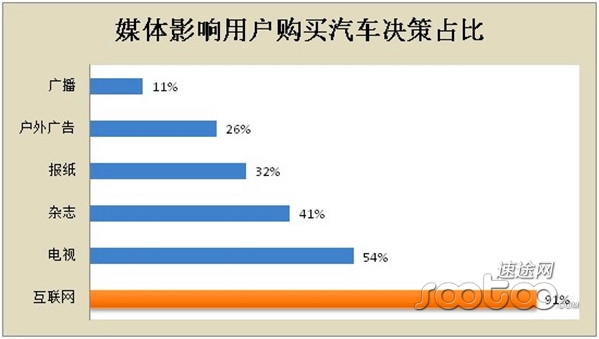 我國汽車市場每年收入增長都高達20%,而影響用戶高買決策最高的是互聯網,影響程度高達91%。但是我國汽車廣告市場的投入卻出現反常情況,主要原因在于汽車廠商和經銷商對互聯網廣告的效果還不太信任,我國網絡購買汽車這樣的環境沒養成,互聯網主要充當的是信息展示的作用。