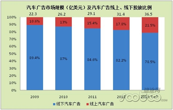 但是,從2009年至今,線上廣告市場的投入比例在不斷擴大。2009年,我國汽車廣告市場規模為22.3億美元,其中線上占比10.6%,線下占比高達89.4%。到了2012年,汽車廣告市場規模31.4億美元,線上廣告占比為17.8%,線下廣告占比則縮小至82.2%。預計在2013年市場規模將會達到36.5億美元,而線上比例將會達到21.5%,線下比例將進一步縮減至78.5%。隨著汽車廠商不斷的打通線上交易環節,線上廣告投入將會進一步擴大, 未來線上、線下廣告投入比例的差距將會進一步縮小。