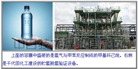 過去,氫氣無法在常溫常壓下裝入塑料容器運輸。而千代田化工開發(fā)的“有機化學(xué)氫化物法”能夠使氫氣與甲苯發(fā)生反應(yīng),生成“甲基環(huán)己烷”(MCH)液體。從甲基環(huán)己烷中分離氫氣雖然一直是個難題,但借助自主開發(fā)的催化反應(yīng)技術(shù),千代田化工取得了成功。